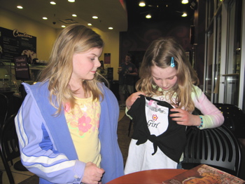 Later, I gave Rylie a gift. She carefully opened up the box, and found a shirt. BOTH Rylie and Tyler looked at the shirt (including the tags–which seemed to be rather interesting apparently!?) BUT did not get that the shirt said “Flower Girl” instead of just “Girl.”