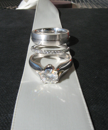 Today we went down to Olympia and Brett’s Mom helped us pick out our wedding rings! I was so excited that we found the perfect set! We chose simple and elegant. My ring is a small band of diamonds and looks really fantastic with my engagement ring. Brett’s ring is brushed white gold with a thin unbrushed grove through the center.