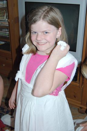 Rylies dress was romantic and full of toliet paper rosettes. She was patient and very excited about her “bling”. After she was so generous to share her bling with me. I wore it on my pinky finger for the rest of the evening!