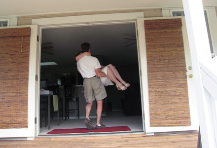 We drove the mini home all decorated and got several thumbs up and cheers on the freeway and through downtown Kirkland. Our neighbors were nice enough to get a photo of Brett carrying me across the threshold.