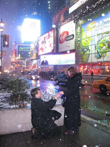 As promised by the fine Toys ‘R’ Us staff, promptly at 10:57, Brett pointed up at the billboard, and Jen initially missed it (do you know how many signs there are to look at in Times Square!?!). Jen gazed across the street, then back at Brett. He was now holding a ring and on one knee while strangers cheered! Jen clearly was shocked and temporarily paralyzed as Brett asked her to Marry him… She saw the billboard now!